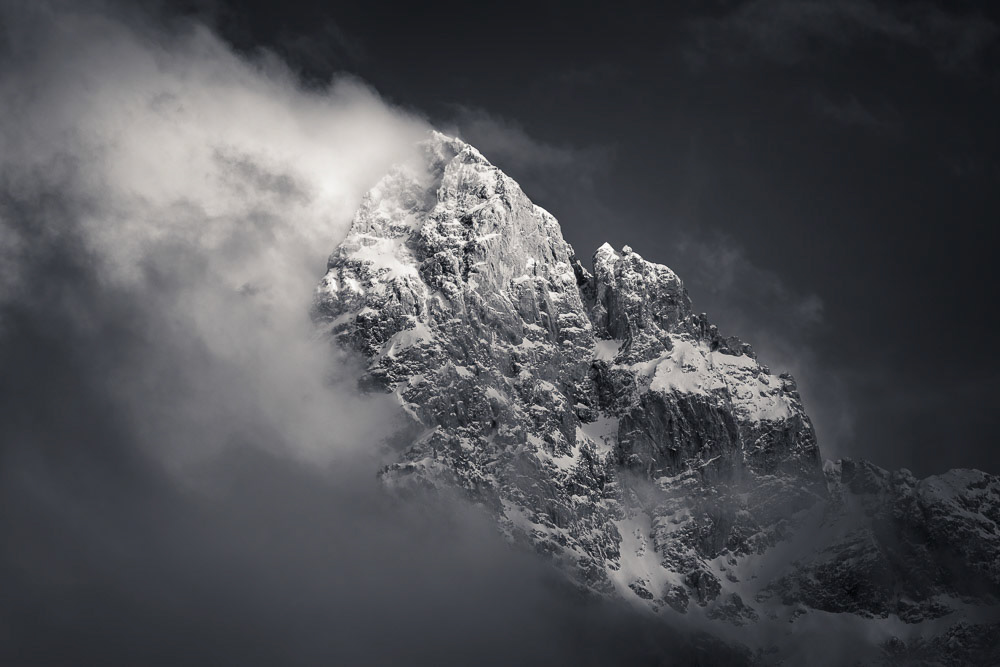 I had visited this area several times while I was living in Munich and I wanted to come away with something different. I was thinking for a portrait kind of shot focusing on the mountain top only. I had therefore used a telephoto lens at 175mm (APS-C) to get in close. The clouds created a beautiful frame when revealing the peak for a brief moment. Getting to this photograph had been a waiting game taking different frames while the clouds were moving through the scene.