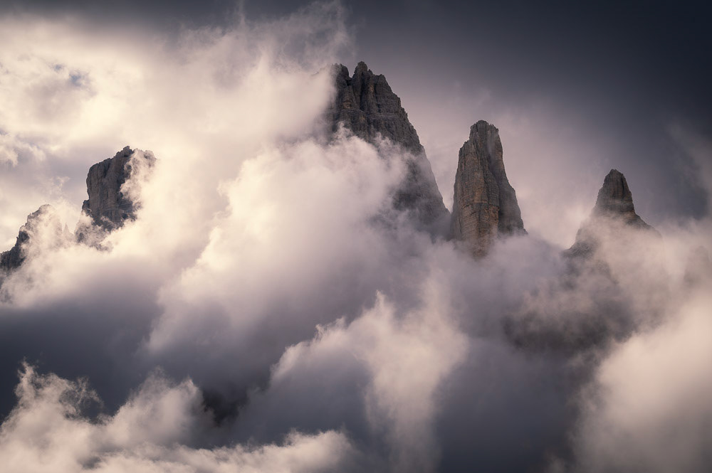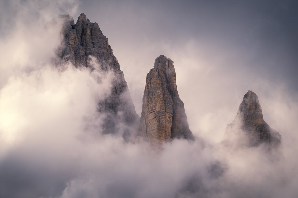 Famous Tre Cime Peaks engulfed by low hanging clouds. Dreamy colored edits.